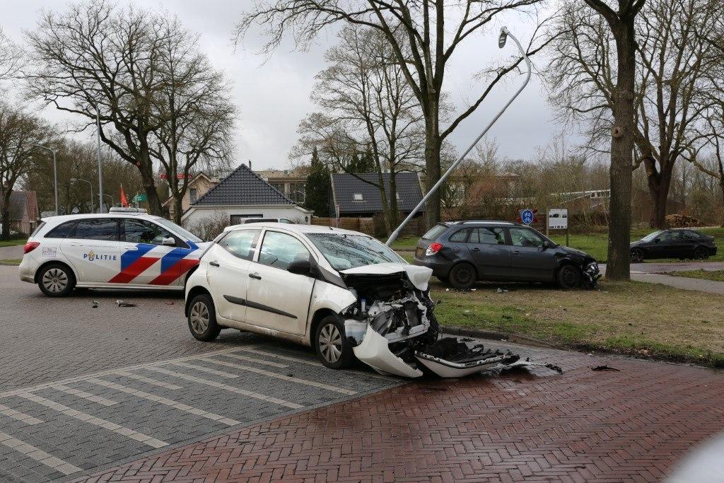 Bij het ongeluk is ook een lantaarnpaal naast de weg geraakt. Deze staat nu scheef.