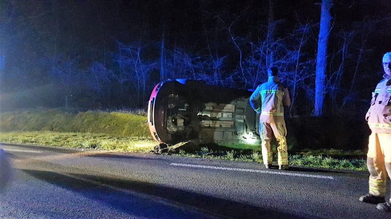 Een automobilist is vanavond van de weg geraakt en op zijn zij in de berm beland tussen Borger en Papenvoort.